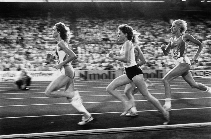 Just over one year later, those three protagonists meet again, over one mile. Decker-Slaney (as she now is) leads fast from the half mile. Coming into the stretch, they are in perfect arrow formation: Decker-Slaney in lane 2, Budd (still only nineteen) on her left in the inside lane, Puica on her right. It looks like Puica’s race. But from some depth of brilliance, Decker-Slaney draws another level of speed, never losing her elegant composure, and crosses in a world record 4:16.70. Whether or not it counts as revenge, it is very sweet.