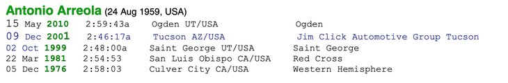 Arreola, 60, is a retired project manager from San Jose, California. He ran his first sub-3, 2:58:03, in 1976, and his marathon best, 2:46:17, in 2001.