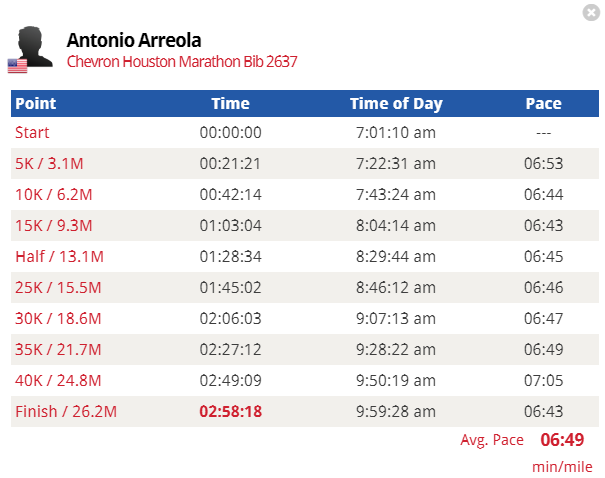 When the crowded streets thinned a little, he worked his pace down to 6:43, and passed the half marathon in 1:28:34. From 21 to 23, he suffered through several ups-and-downs at highway underpasses, but by then Schmidt had arrived to help. “I started lifting my knees a little more to relieve the quads, and that seemed to help,” Arreola said.