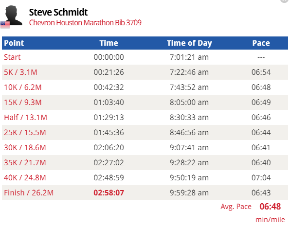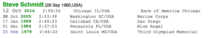 Schmidt, 59, is a retired helicopter pilot from Orion Township, Michigan. He ran his first sub-3, 2:46:22, in 1979, and set his marathon PR, 2:37:03, in 1984.