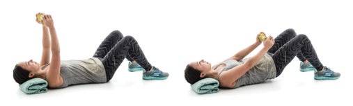 - Hold a light weight (start with 5 pounds) in both hands and raise your arms toward the ceiling. In this position, inhale and relax your pelvic floor.