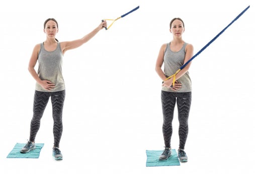 - Secure a light resistance band to a surface that’s at least a foot taller than you. Hold the band in your left hand with your arm out to your side, and take a few steps laterally until you feel slight tension.