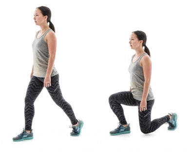 - Stand with feet hip-width apart, then step your left foot back and place the ball of your left foot on the ground. Keep your front shin vertical and maintain your center of gravity over your front foot.